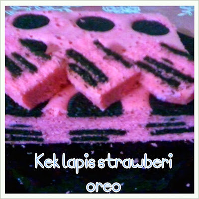 Hari ni aku mau share entri kek iaitu Kek lapis strawberi oreo..em, sapa yang tidak suka oreo..semua orang suka kan..makan begitu saja atau cicah dalam susu..sedapnya..Apapun,kek ni sangat lembut..ada rasa strawberi dan oreo bila makan kek ni..sebenarnya resepi asal guna biskut marie dan pandan paste tapi kali ni aku ubah perisa dan juga biskutnya..
